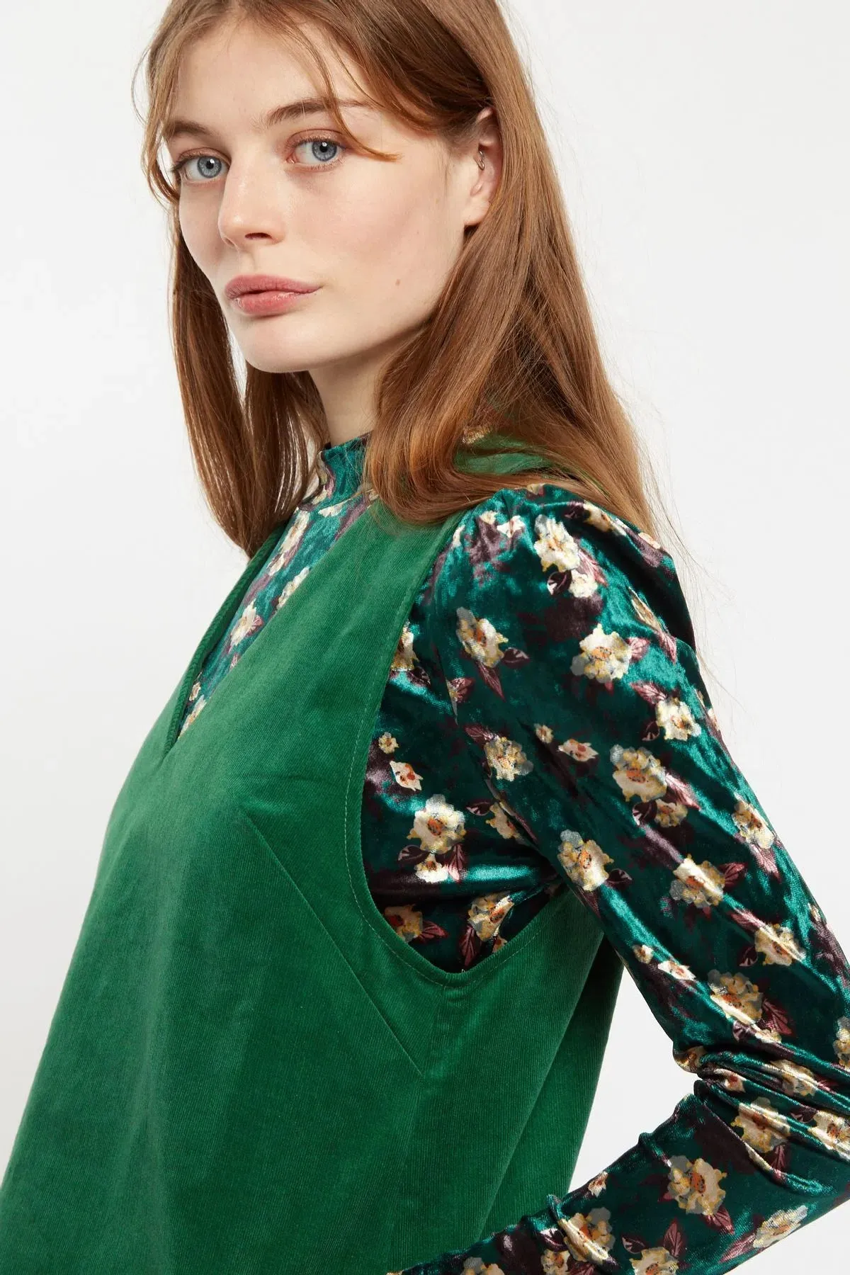A 60's inspired baby cord pinafore featuring two big patch pockets making it just so practical to wear. Team with a fine knit turtle or polo neck to complete the outfit. Style with ankle boots for the perfect 60's vibe.