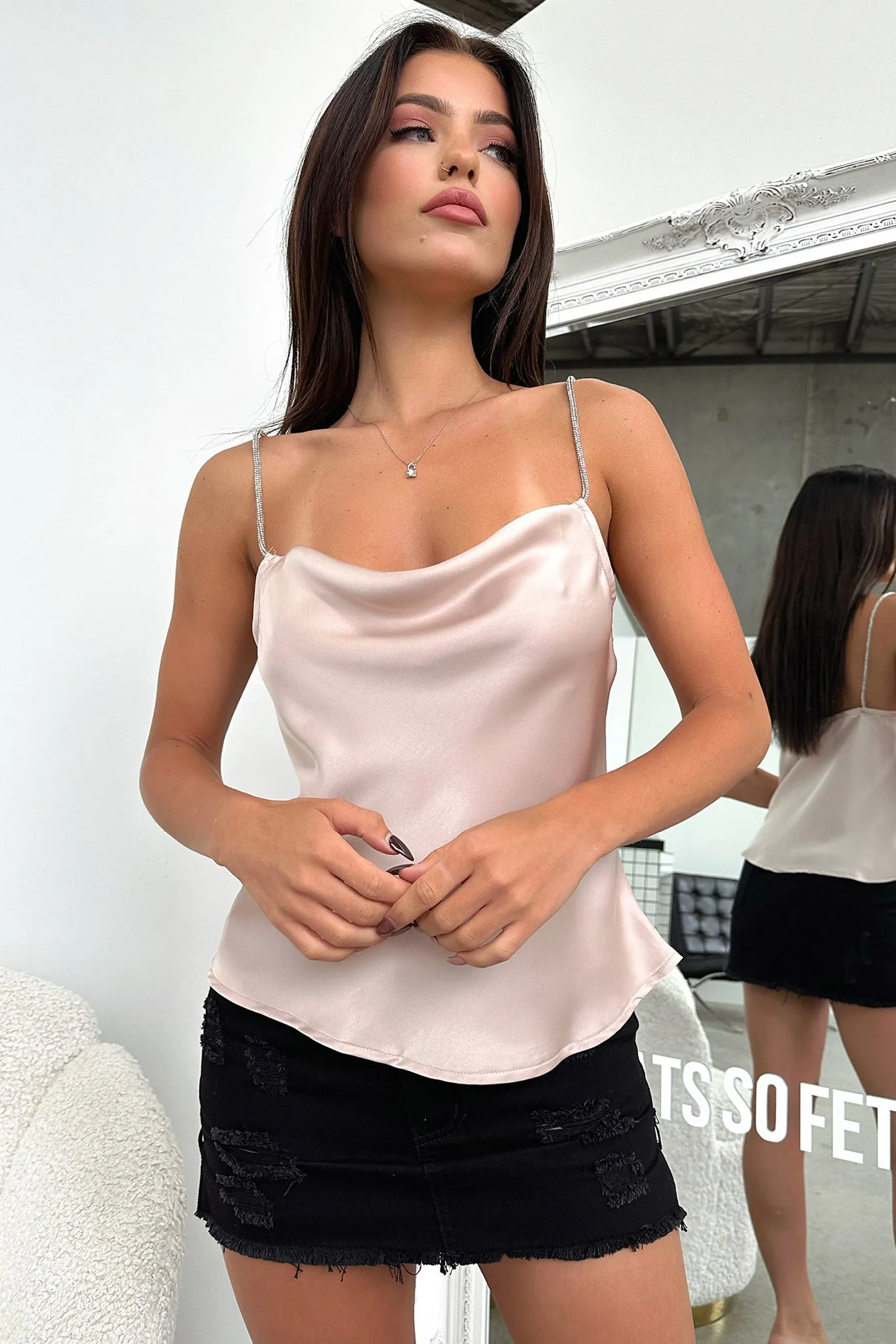 Chic and classy! The Azalea Top offers a satin like material, a relaxed fit, diamond shoulder straps and a cowl neckline. Match her with a Black midi skirt and nude heels for a sweet cocktail look.