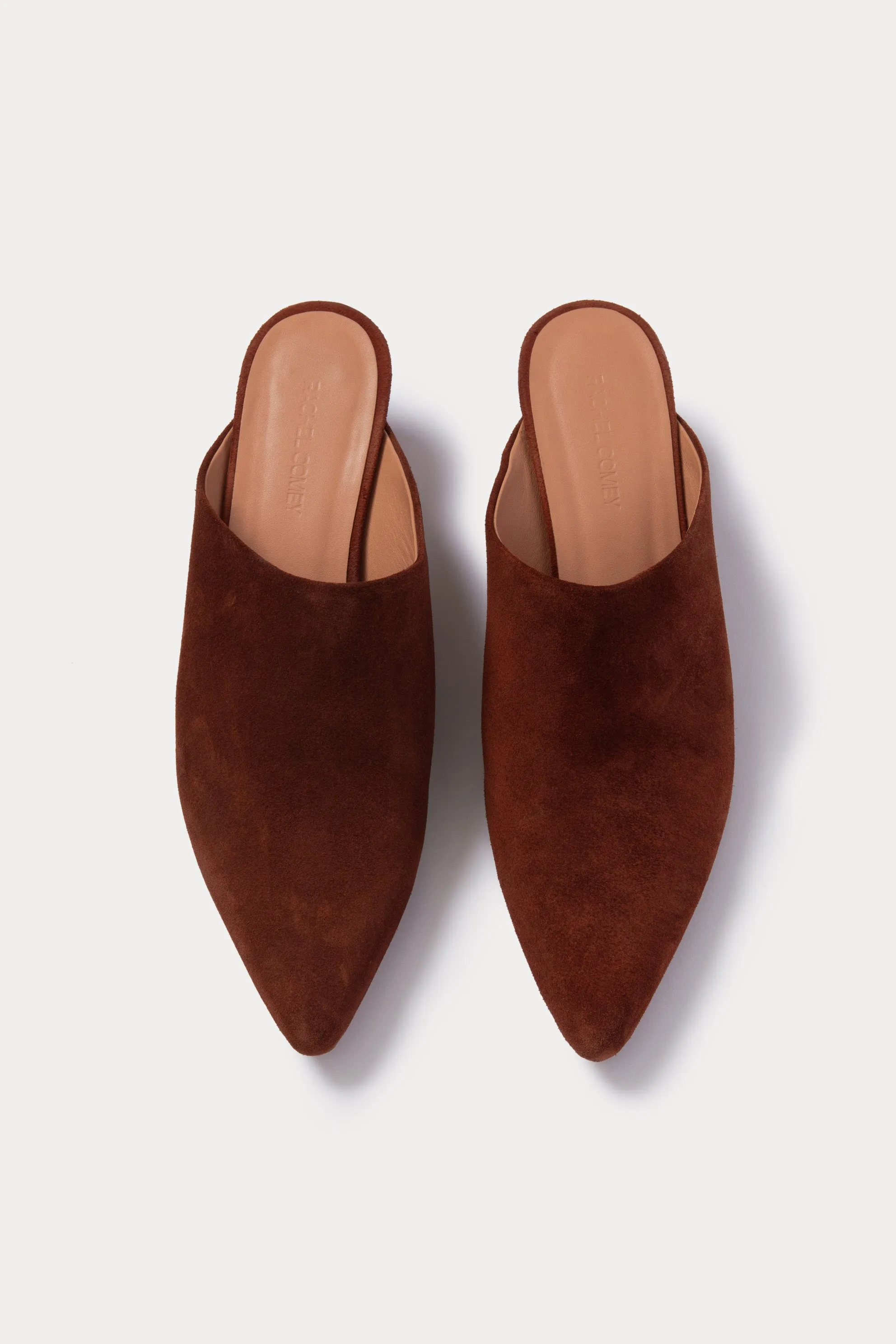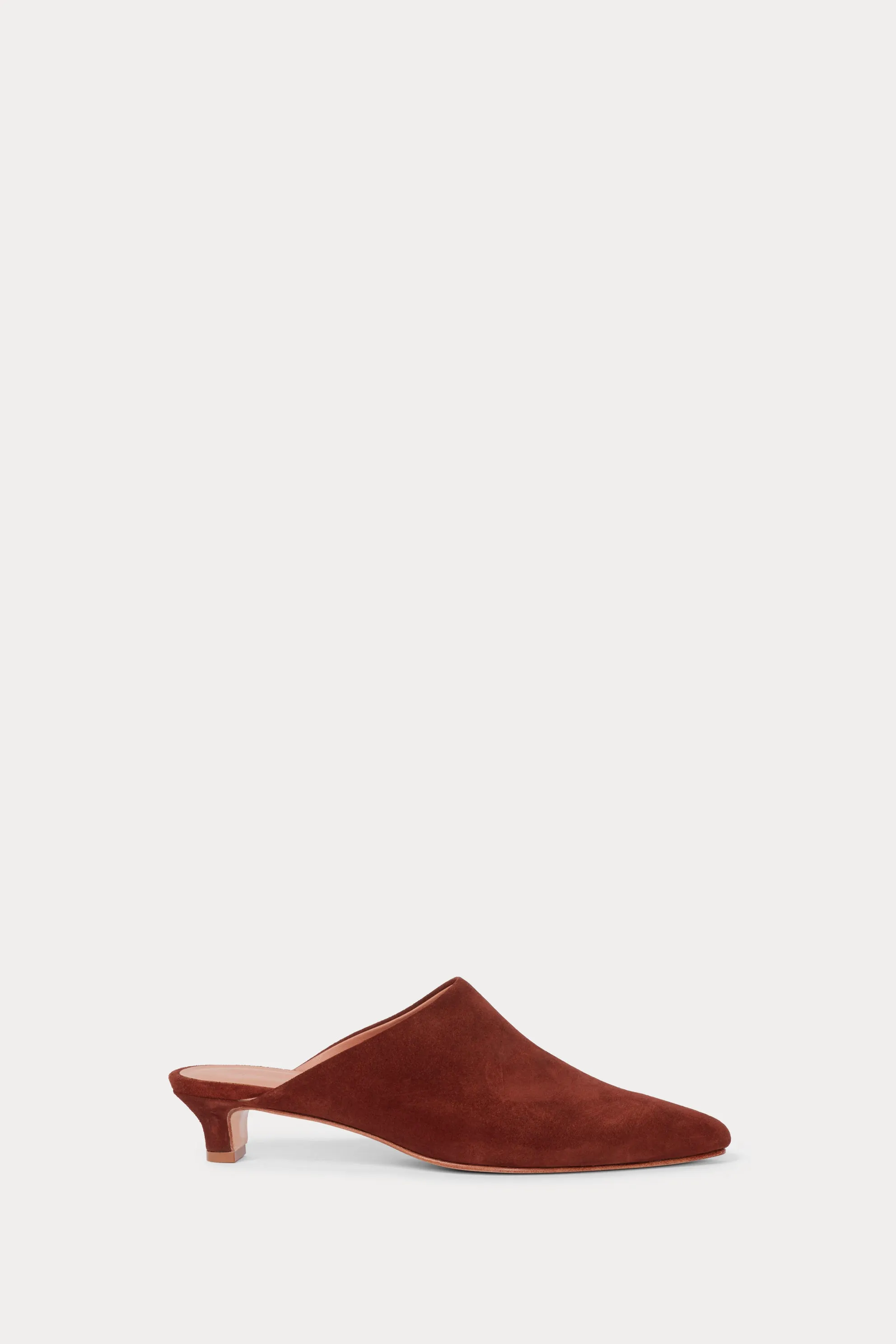Minimalist mules with a pointed toe and low kitten heel in soft suede.