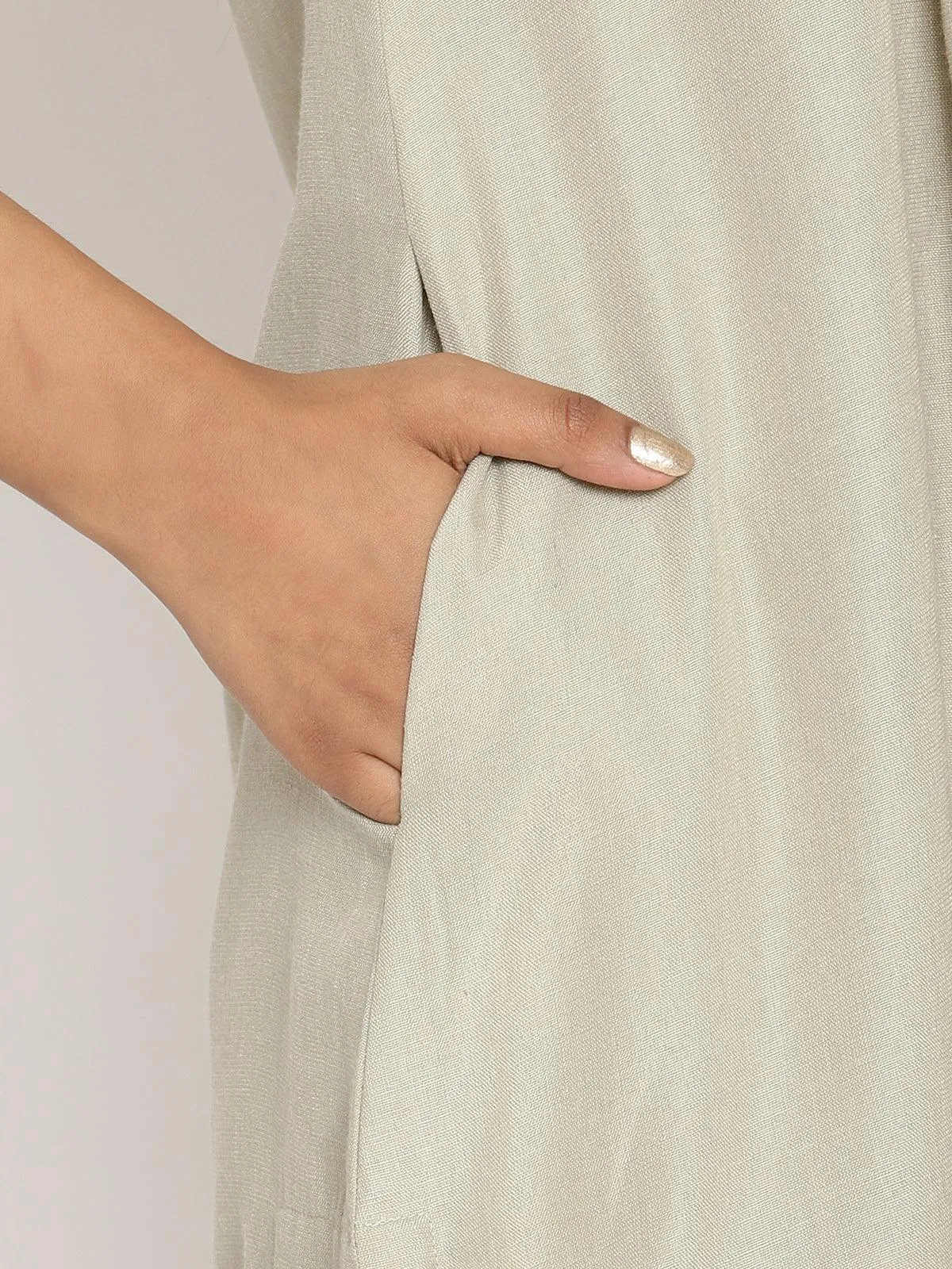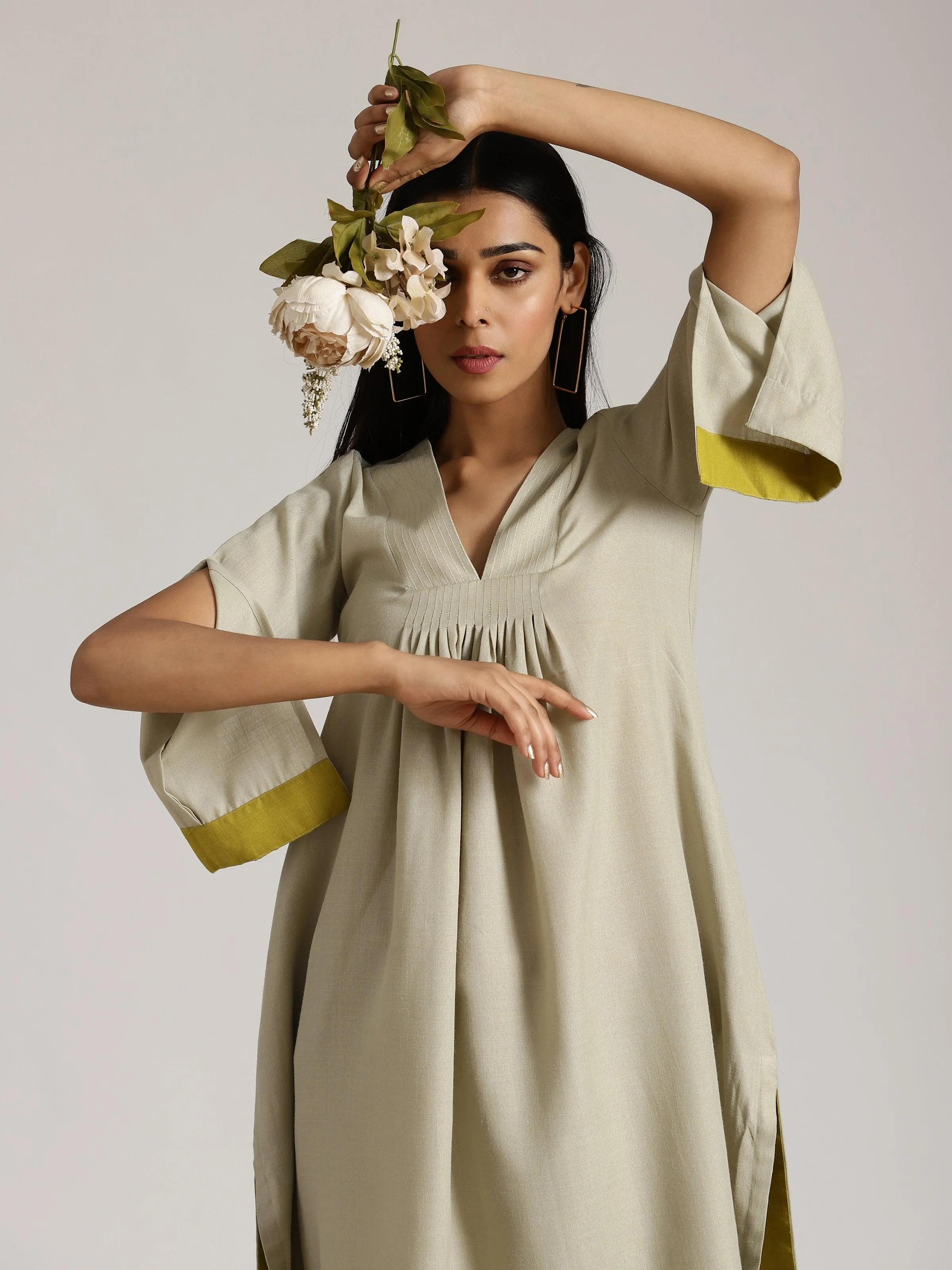 - Soothing Cotton Linen comfortable flared slit Kurta with front pleats and contrast inner facing detailing on slit and sleeves. It has two side pockets. It comes along with bottom with elasticated waist.