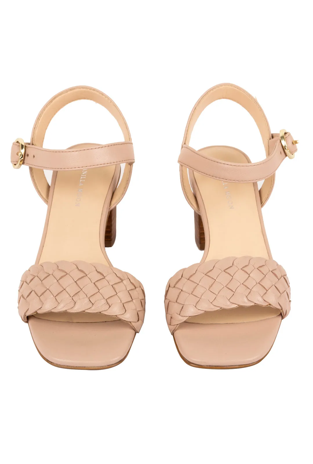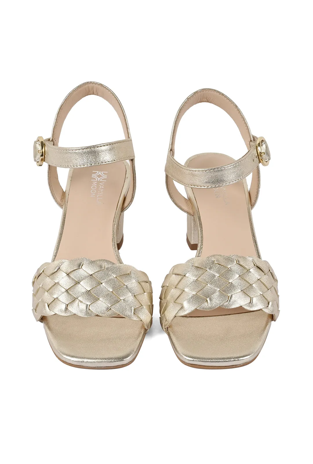Block these block heeled sandals before we run out! Detailed with a veneer covered heel, an ankle strap, a woven upper and a gold buckle for chic comfort!