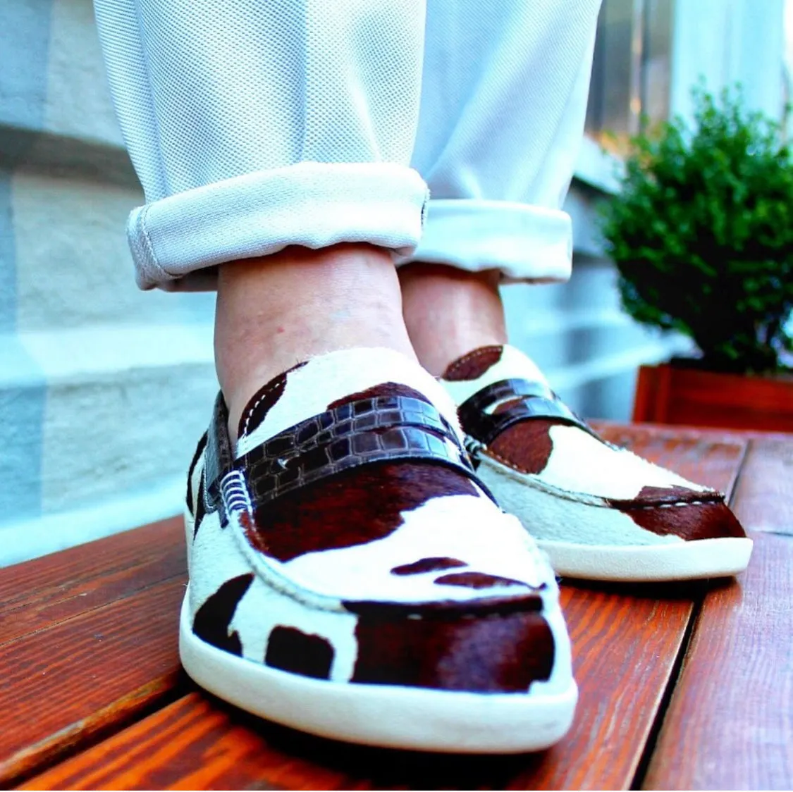 Introducing the Johnny Famous Bally Style Pony Men's Brown Animal Print Leather and Suede Slip Ons – where timeless elegance meets modern flair. These iconic loafers capture the essence of urban fashion from the 80s, making a bold statement that transcends generations.