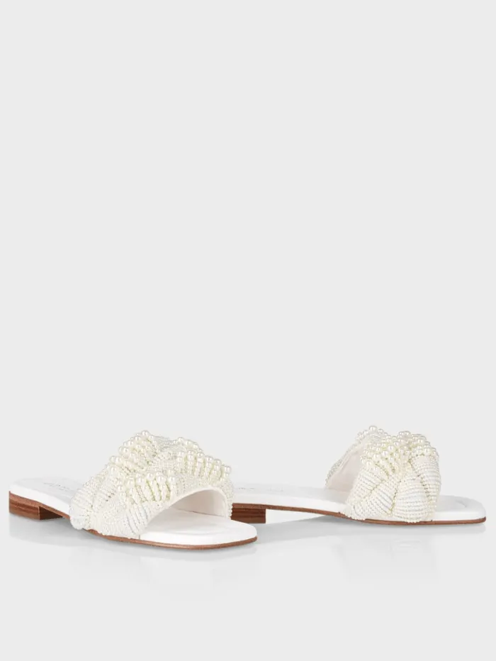 Pretty mules with straps embroidered all around with hand-embroidered beads. With flat heels and a soft footbed making them a super comfortable wear for all day, everyday. In a fashionable light square shape. Lovely footwear to add interest and glamour to a casual outfit or complement a special occasion outfit with lovely details on your feet.