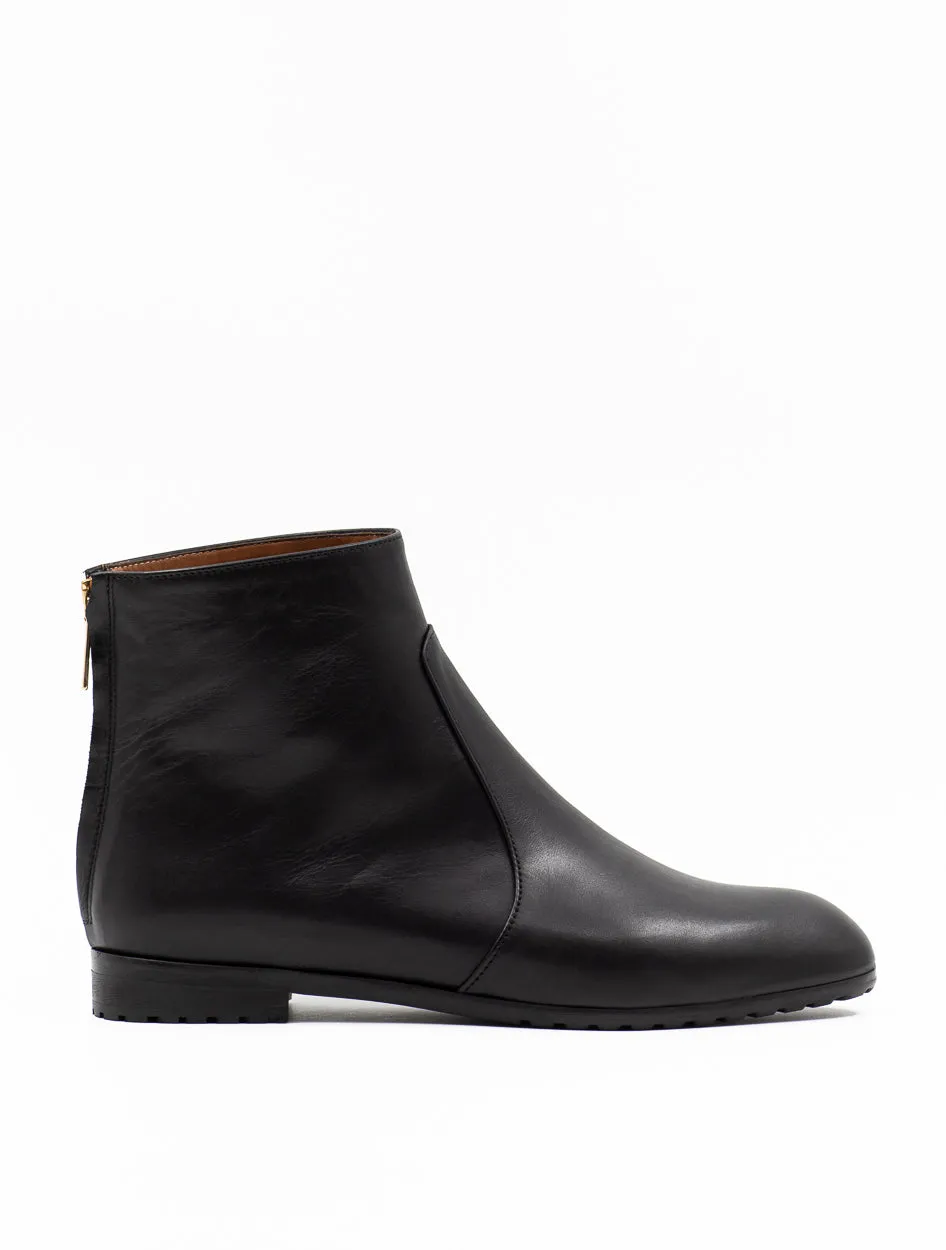 These short ankle boots have been a favourite among our customers for many years, and we can see why. The feminine, yet sleek design makes them perfect for both everyday use and dressier occasions. They have been handmade in Italy from soft black leather and feature practical rubber lug soles with patterned indentations designed to ensure a good grip. Easy to take on and off thanks to the zipper in the back.